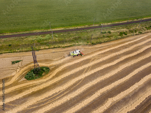 © Sergey, Obraz premium Aerial drone view. Harvested Ukrainian wheat field.