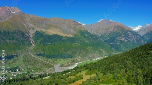 © monvideo, Fototapeta premium Aerial drone view of a river in a mountain valley against a blue sky.