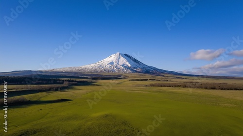 © Elena, Fototapeta premium Aerial drone view of a snow-capped volcano with green field at summer