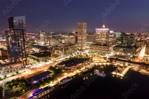 © suraju, Fototapeta premium Aerial Drone View of Baltimore City Inner Harbor before Dawn