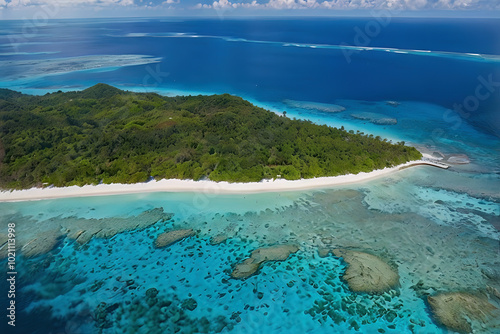 Obraz premium Aerial Drone View of Beautiful Beach with Clear Turquoise Lagoon Water, Lush...