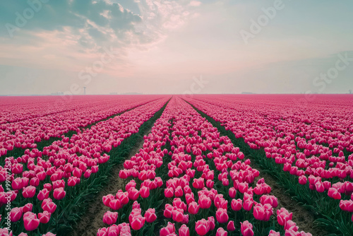 Naklejka premium Aerial drone view of colorful pink tulip fields leading to the horizon,...