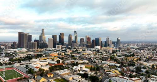 © Volodymyr, Fototapeta premium Aerial drone view of downtown Los Angeles. American dream LA cityscape. Iconic urban view of America. California LA city skyline. Modern metropolis in USA. LA dream city. LA skyscrapers from top.