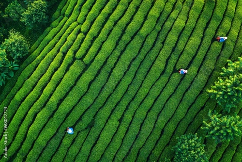 © Dina, Fototapeta premium aerial drone view of green tea plantation highlands from above with hats of tea collectors or pickers seen from distance. Tea industry asian countries.