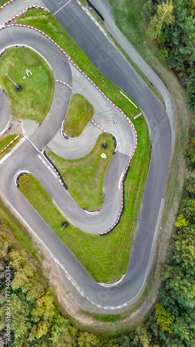 © Iuliia Sokolovska, Naklejka premium Aerial drone view of karting race track in green forest with racing go-karts cars driving, kart racing open wheel motorsport, vertical image