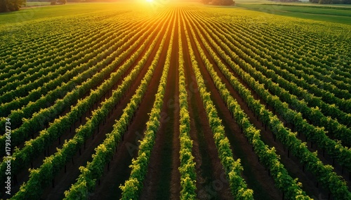 Obraz premium Aerial drone view of neat rows of green grapevines under golden sunset....