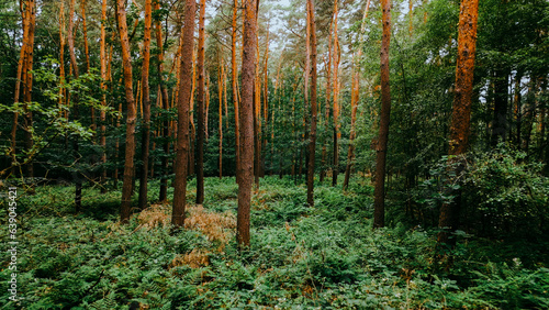 © nikkimeel, Fototapeta premium Aerial drone view of pine forest, camera between trees.