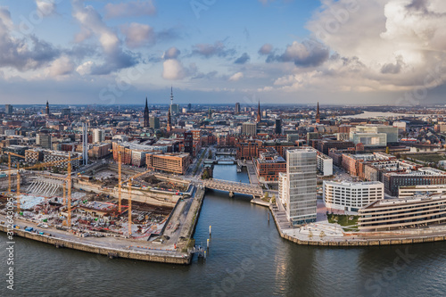 Obraz premium Aerial drone view of Port of Hamburg with clouds over historical city center...