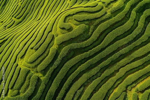 © Dzikrul Husnani, Fototapeta premium Aerial drone view of shapes of Cha Gorreana tea plantation at Sao Miguel, Azores, Portugal , ai