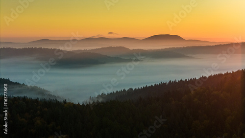 © marcin jucha, Fototapeta premium Aerial drone view of sunrise above clouds in mountains