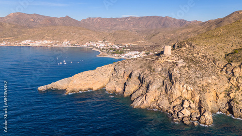 Obraz premium Aerial drone view of the coastal town and beach in La Azohia, Spain