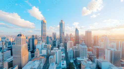 Fototapeta premium Aerial drone view of the vibrant cityscape at dawn, with towering skyscrapers and urban life. The soft light of the morning sun bathes the buildings, dynamic landscape for the beauty of metropolitan.