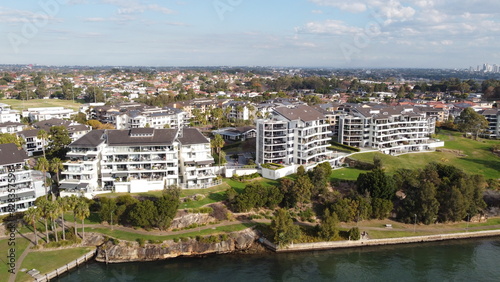 © HDC Creative, Fototapeta premium Aerial drone view of waterfront property and houses