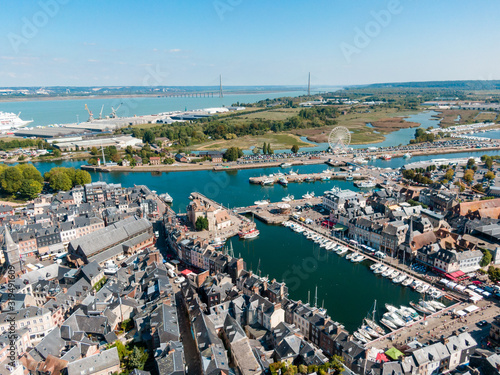 © STUDIO MELANGE, Obraz premium Aerial drone view on Honfleur, France some with famous places and architecture of the village