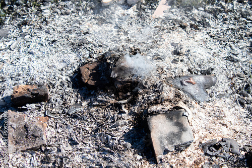 © Uladzislau, Fototapeta premium Aerial Drone View Over Burning Dry Grass and Smoke in Field. Flame and Open Fire. Top View Black Ash