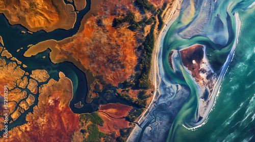 © Nemanja, Naklejka premium Aerial drone view satellite photography of planet earth geography map with ocean or sea coast and land. Blue and orange global overview image, continent picture from space, terrain environment