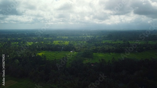 Obraz premium Aerial drone view to green rice fields and jungle in Bali