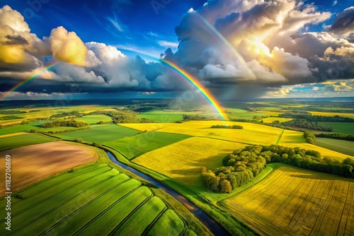 Obraz premium Aerial Fantasy Landscape: Sweet Green, Yellow, Rainbow, Fluffy Clouds