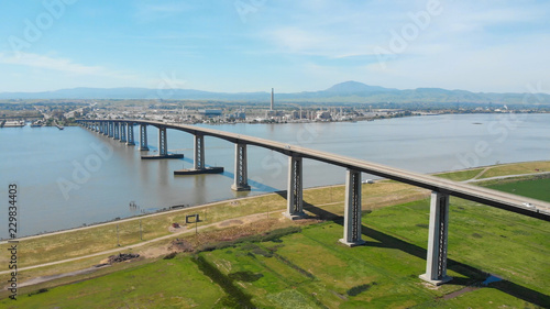 Obraz premium AERIAL: Flying along traffic driving down the spectacular concrete bridge.