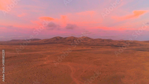 © helivideo, Fototapeta premium AERIAL: Flying away from big volcanic structure in pink colored desert sunset.