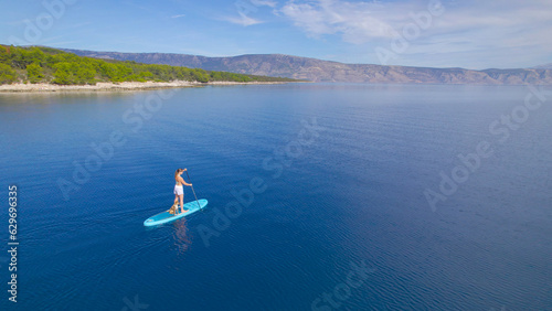© helivideo, Naklejka premium AERIAL: Gorgeous shore and blue sea water with lady and her dog paddling on SUP