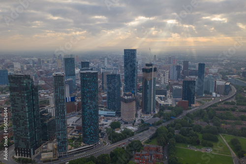 © bardhok, Fototapeta premium Aerial image of Manchester cityscape in the morning with sun-rays breaking through the clouds