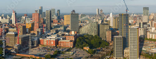 © bardhok, Fototapeta premium Aerial image of Manchester skyline in the morning showing Northern Quarter area and Victoria Riverside.