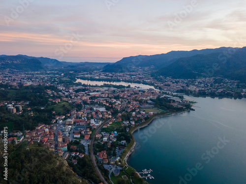 Fototapeta premium Aerial landscape Lago di Garlate Lake Lecco Como mountains Italian Alps Fall sunset in Lombardy