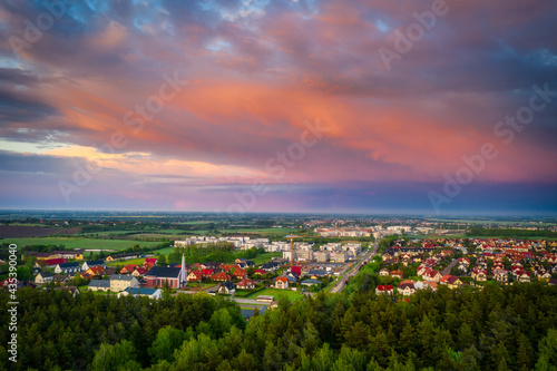 Fototapeta premium Aerial landscape of small village in Poland at sunset.
