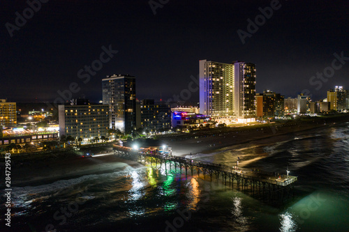 Naklejka premium Aerial night photo Myrtle Beach fishing pier and hotel condominiums