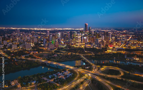 © Thomas, Obraz premium Aerial night view of Edmonton skyline and highway interchange