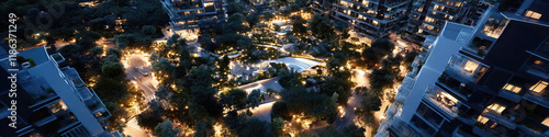 © Lila Patel, Naklejka premium Aerial Night View of Residential Complex with Central Park