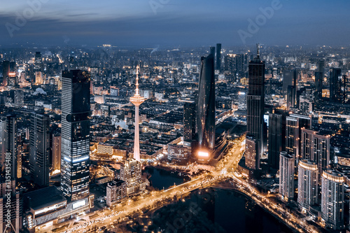 Obraz premium Aerial Night View of Skyline of TV Tower in Shenyang, Liaoning Provine, China