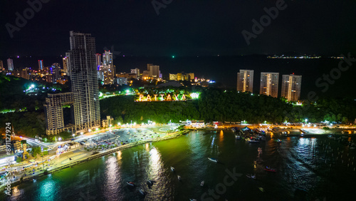 © Michele, Naklejka premium aerial of Pattaya Thailand sign city illuminated at night with skyline cityscape