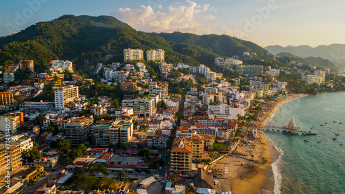 © Michele, Fototapeta premium Aerial of Puerto Vallarta Mexico Nayarit pacific coastline at sunset with waterfront hotel in the romantic zone