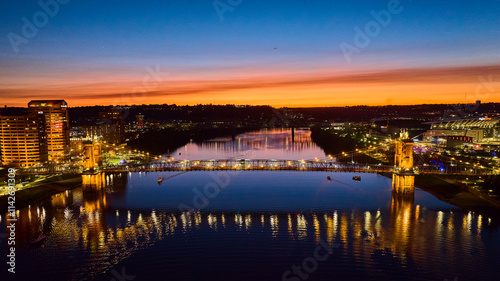 © Nicholas J. Klein, Fototapeta premium Aerial of Roebling Bridge at Dusk with Vibrant Skyline Reflections