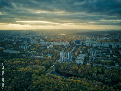 © Igor Syrbu, Fototapeta premium Aerial over the city in autumn at sunset. Kihinev city, Moldova republic of.