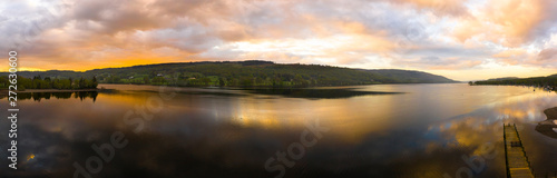 © Studio-FI, Fototapeta premium Aerial over the lake district Coniston lake during a dramatic sunrise surrounded by mountains, England panoramic