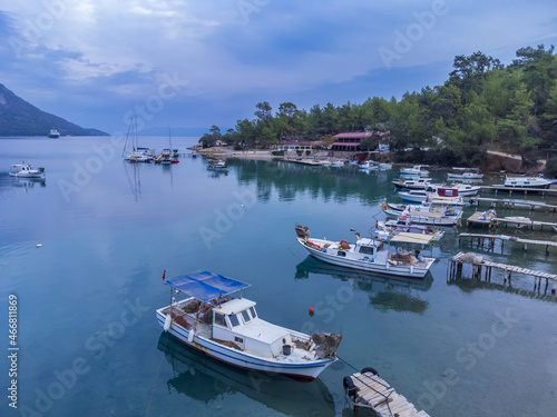 © klenger, Fototapeta premium Aerial Overhead Drone Shot of Yachts at Akbuk Cove Aegean Sea on Turkey Summer