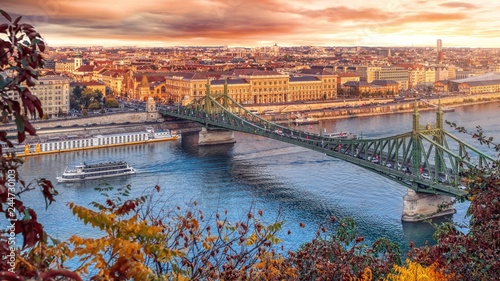 © Augustin Lazaroiu, Obraz premium Aerial panorama of Budapest, Hungary. Sunset over the city with the Liberty Bridge, the Danube river.