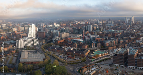 Obraz premium Aerial panorama of Leeds cityscape skyline with an early morning sunrise