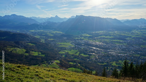 © vadim_ozz, Fototapeta premium Aerial panorama of Salzburg and Alps from the top of Untersberg mountain in Austria.