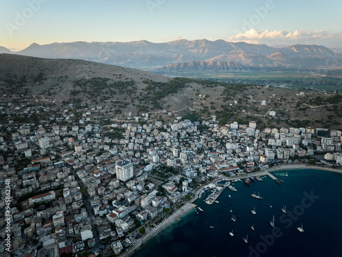 © Zarina, Fototapeta premium Aerial panorama of Sarande (aka Saranda), Albania. Photo taken with drone at sunset