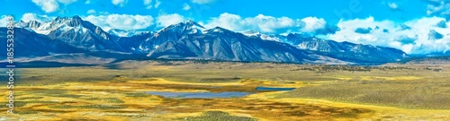 © Nicholas J. Klein, Fototapeta premium Aerial Panorama of Snow Capped Mountains and Golden Valley Eastern Sierra California