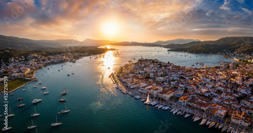© moofushi, Fototapeta premium Aerial panorama of the city and harbor of Poros island in the Saronic Gulf, Greece, during a colorful summer sunset