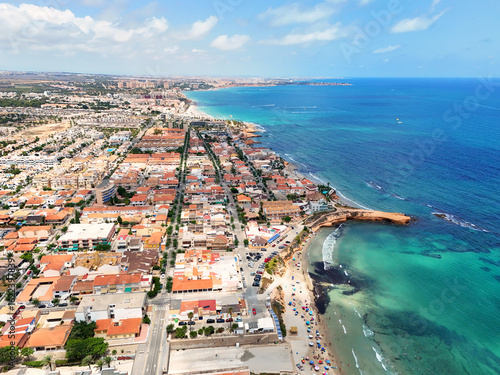 © Alex Tihonov, Naklejka premium Aerial panorama of Torre de la Horadada on the Costa Blanca, showing colorful rooftops, sandy beach, turquoise Mediterranean waters, rocky coastline, and vibrant summer atmosphere