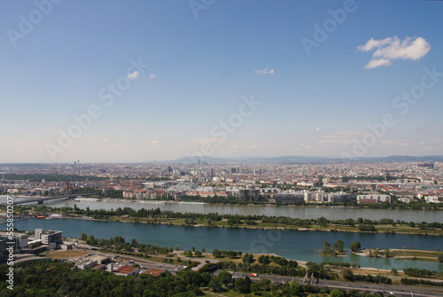 Fototapeta premium Aerial panorama of Vienna and the Danube River flowing through it on a sunny...