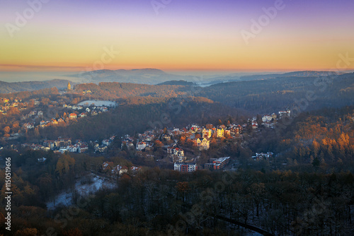 © sergei, Obraz premium Aerial panorama over Thuringian city Eisenach from Wartburg Castle in winter.