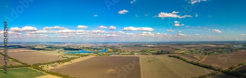 Fototapeta premium aerial panorama view of ponds and village Nekrasovskoye surrounded by autumn fields (South of Russia, Kuban) on a sunny day in October