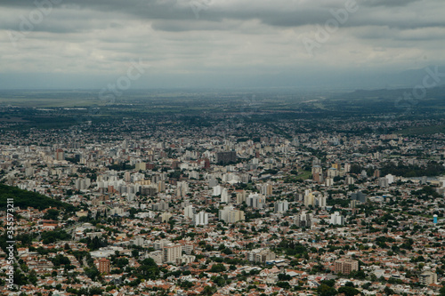 © Gonzalo, Fototapeta premium Aerial panorama view of the city Salta, in Argentina, at the foot of the mountains. Many concrete buildings in the valley under a cloudy sky